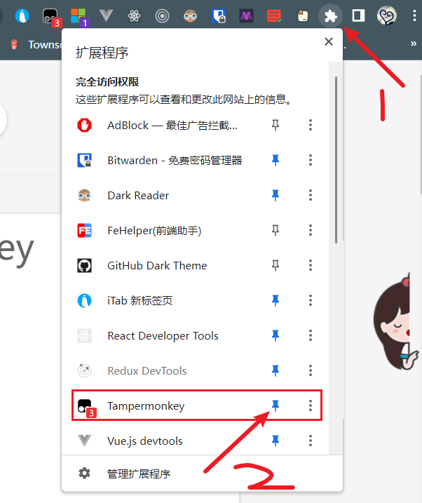 1. 将插件固定在浏览器顶部,该步骤是为了更方便的控制。